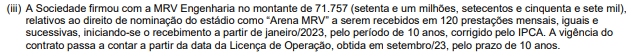 “Em dezembro de 2021, a Arena MRV possui compromissos firmados com a Arcelor Mittal referente a um contrato de patrocínio, onde foi adquirido o ‘sector naming right’ dos camarotes, bem como, ativações de marketing como o ‘Aço oficial da Arena MRV’ pelo período de cinco anos, contando a partir da obtenção da Licença de Operação, tendo um valor residual a receber de R$ 3.250 mil, mediante ao cumprimento das contrapartidas de marketing acordadas no período.”